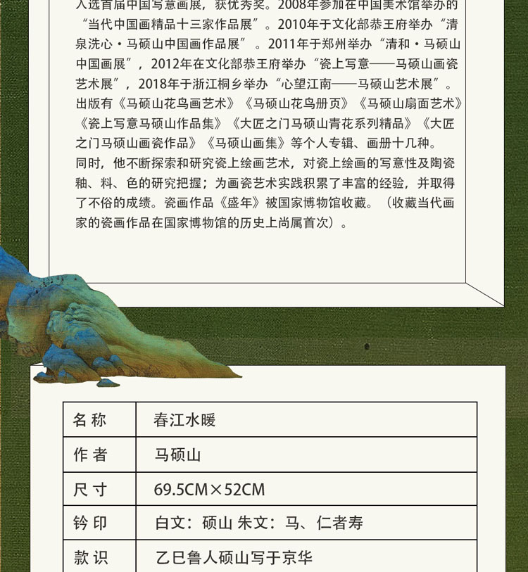1998年作品入选第二届全国花鸟画展获优秀奖,2000年作品入选文化部主办的第十二届“群星奖”美术大展获银奖,2005年作品入选首届中国写意画展获优秀奖。2008年参加在中国美术馆举办的“当代中国画精品十三家作品展”,2010年在文化部恭王府举办“清泉洗心 马硕山中国画作品展”。2012年在文化部恭王府举办“瓷上写意 马硕山画瓷艺术展”,瓷画作品《盛年》被国家博物馆收藏。出版个人专辑、画册十余种。